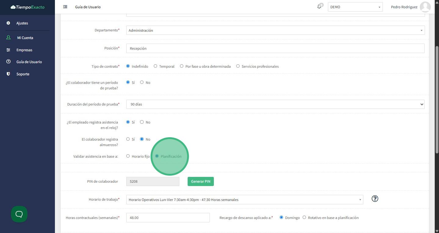 3. Paso 3: Buscamos "validar asistencia en base a:" aqui tenemos que asegurarnos que este seleccionado la opción de "planificación" y que el empleado mantenga la opción de registra asistencia en el reloj "SÍ"
