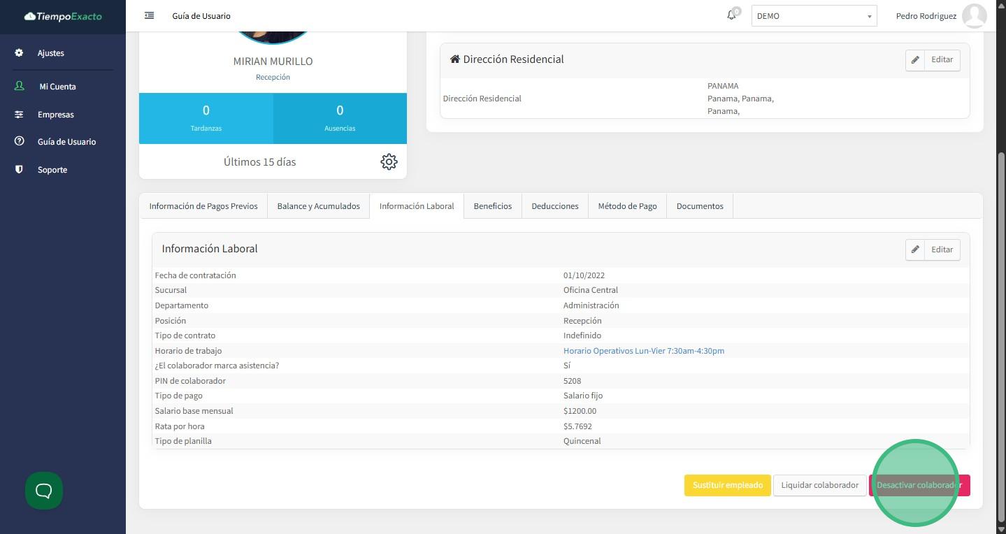 1. Si tienes un colaborador que no quieres que salga en la planilla actual por permiso, vacaciones, riesgos u otro, solo debes inactivarlo.🚀 Paso 1: Entra al perfil del colaborador y en la parte inferior derecha presiona el botón rosado que indica "desactivar colaborador"
