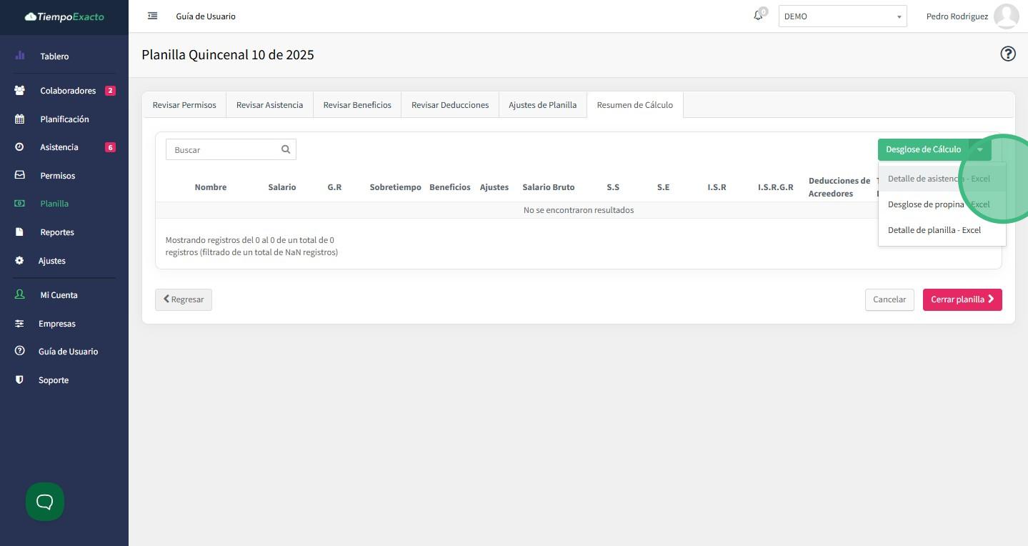 En el resumen de cálculo no se muestran las horas regulares de los empleados. 1. Los empleados con salario fijo no tienen sus horas regulares reflejadas en el resumen de horas; únicamente se mostrarán los recargos correspondientes.
