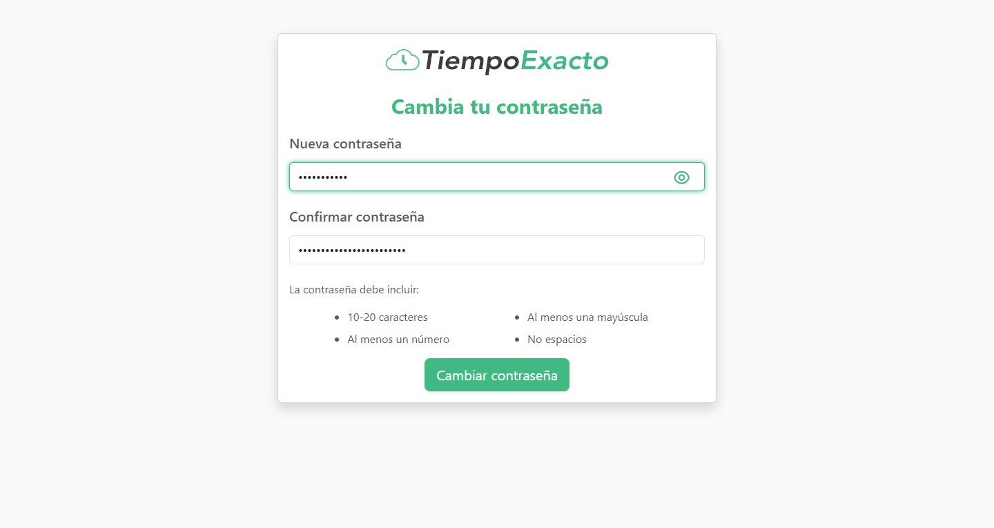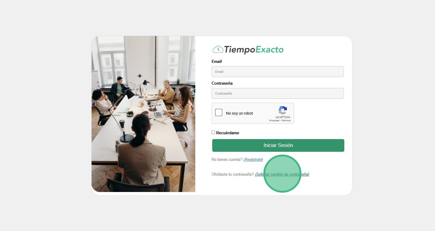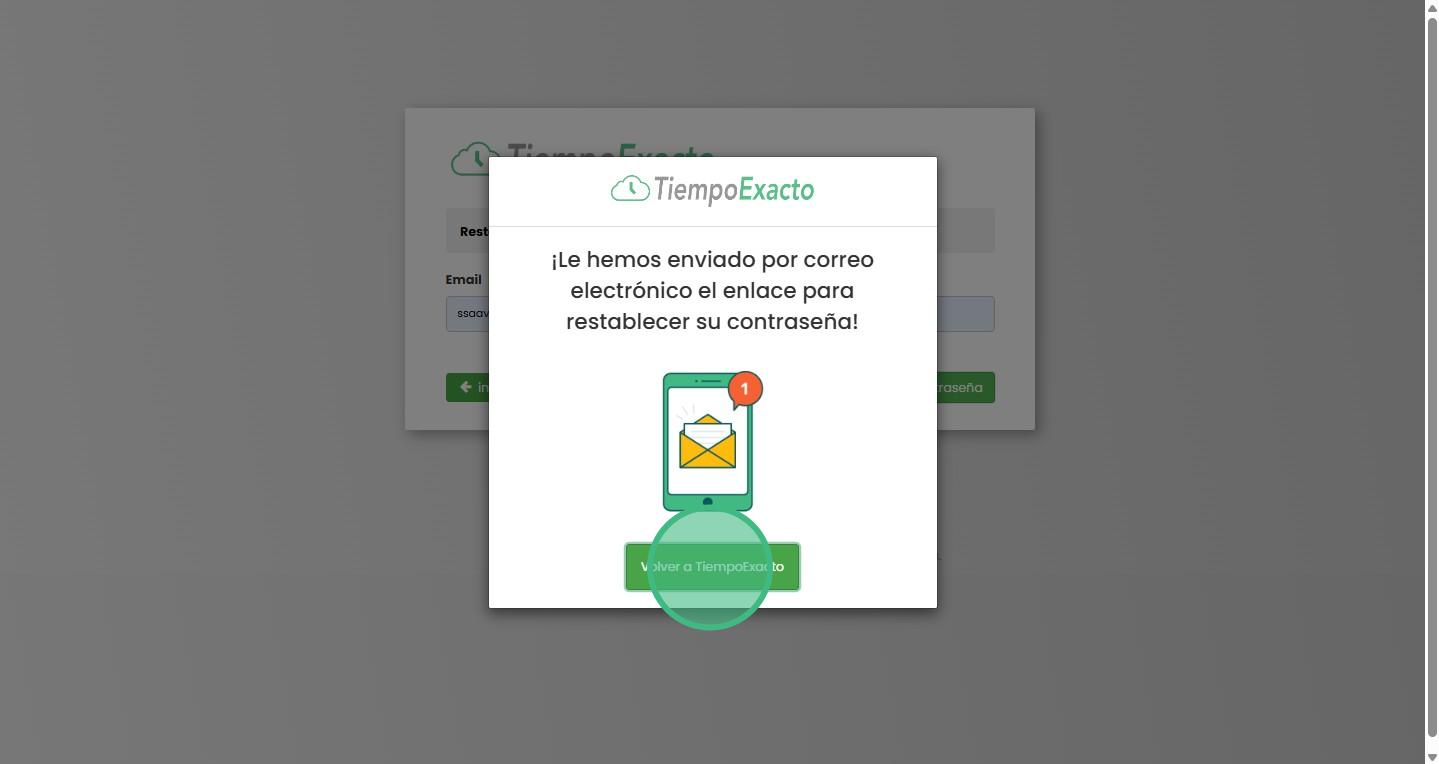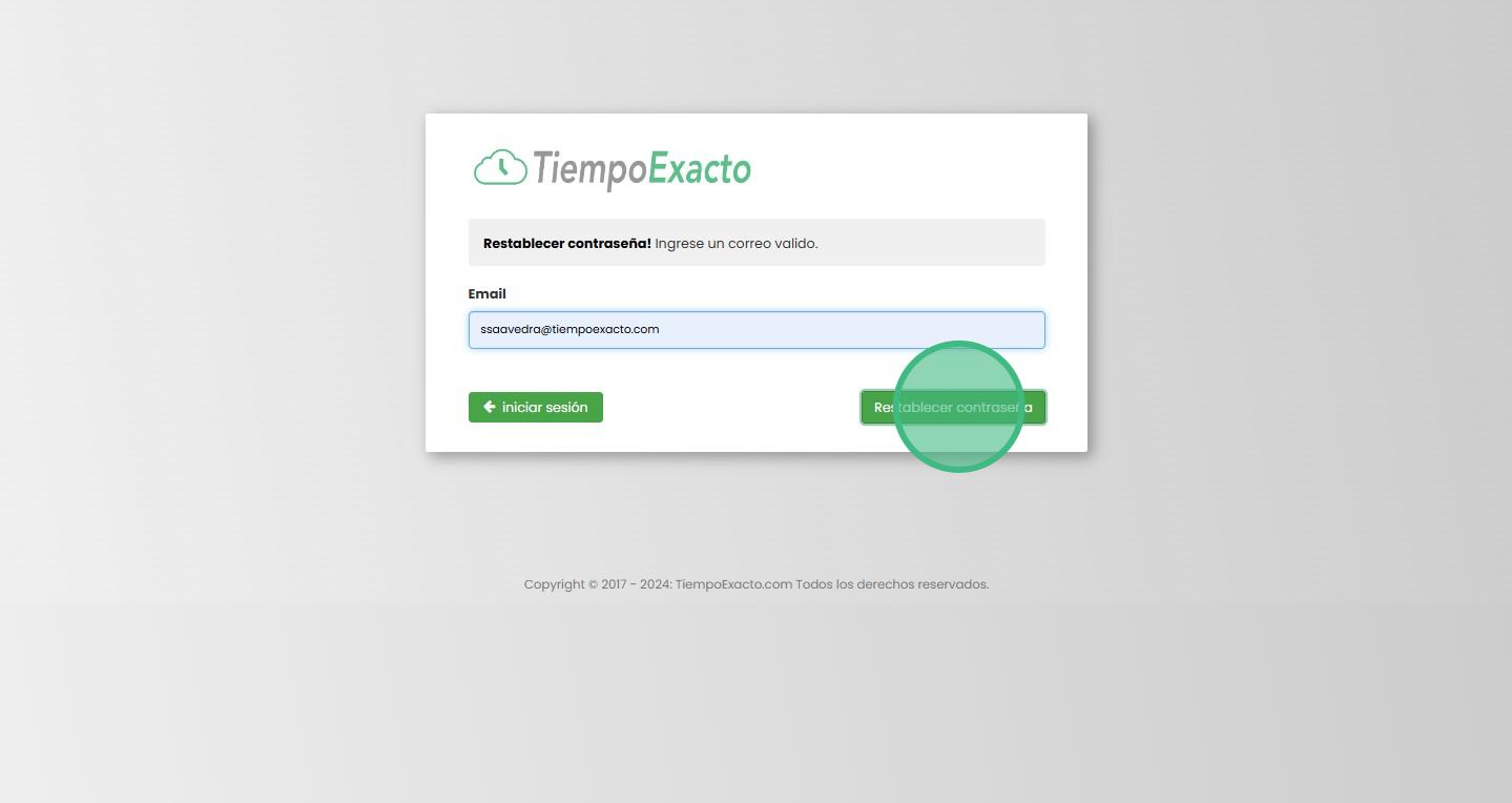2. Paso 2: Ingresa tu correo electrònico. Recuerda que debe ser el correo que ingresas en TiempoExacto. Y colocas, reestablecer contraseña.