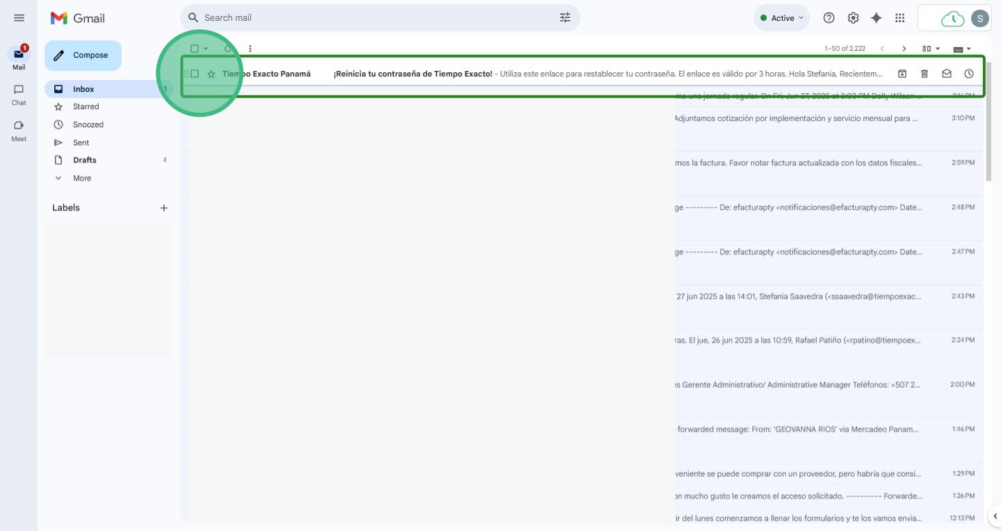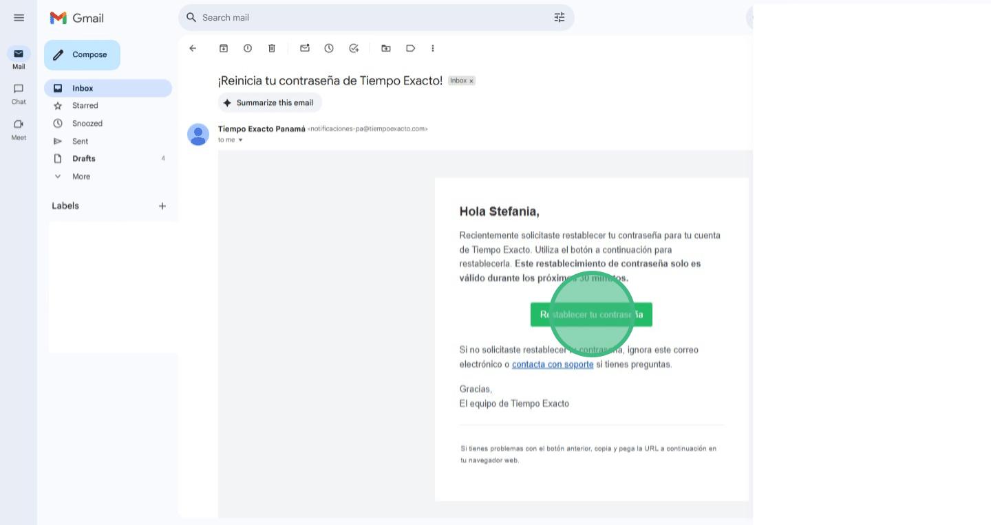 4. Paso 3: Abre el correo que te llego a tu bandeja de entrada. Porporcionado por "Tiempo Exacto Panamà" y que te indica "Reinicia tu contraseña de Tiempo Exacto"
